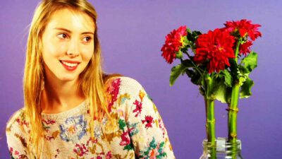 Transcript Woman: Flower arrangements floppy? Man: Quick tips! Woman: Create a grid of clear tape over the top of your vase. Then place the stems through it to add stability. Beautiful!