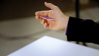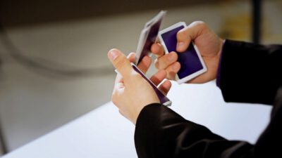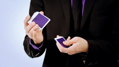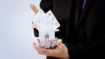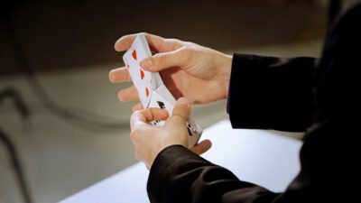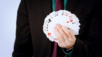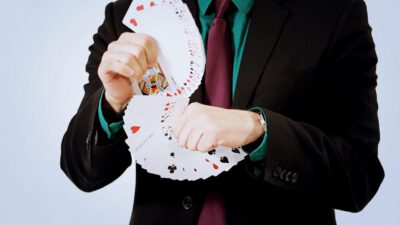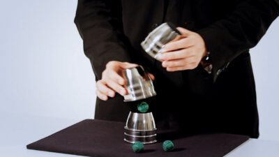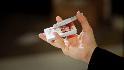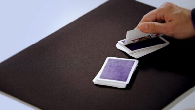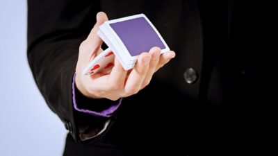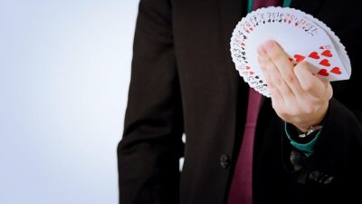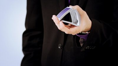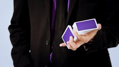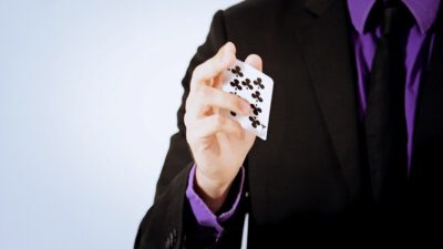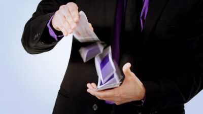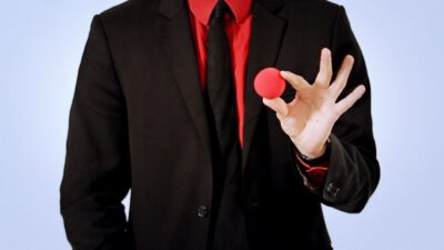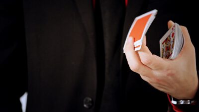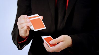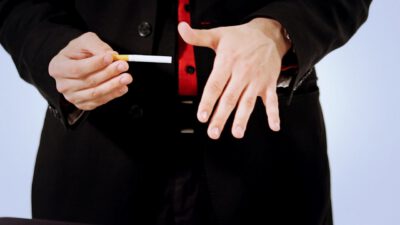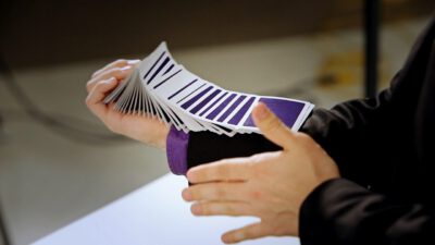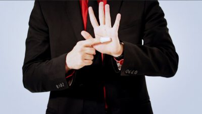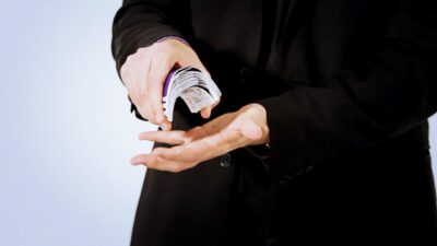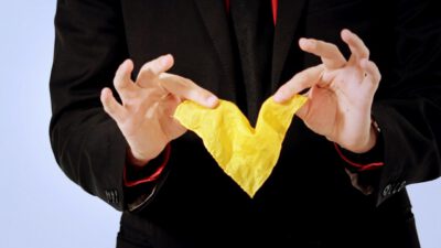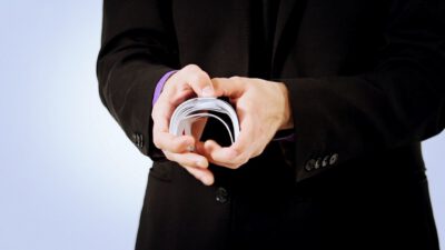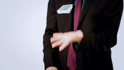 Hi, I’m Mike Patrick, and this is how to make a coin vanish. You take the coin, you blow, and the coin disappears and reappears like this. It can also go into this elbow and come out of here, and that’s how you make a coin vanish. What happens is these fingers are here. The coin comes into the hand. As the coin approaches, what you’re simulating is taking the coin like this. What’s actually going to occur is the thumb releases its grip and the coin, when I do it, it almost pivots like this. So when the coin goes into the hand, when these fingers screen, when these fingers touch each other, that’s when it comes inside, and then your hand closes like this.