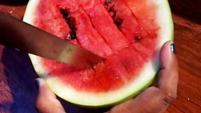 Instructions Step 1: Cut in half Cut the washed watermelon in half lengthwise. Step 2: Make lengthwise cuts Take one half with rind side down, and make straight slices one inch apart through the length of the watermelon flesh, without cutting through the rind. Hold the knife at a 45-degree angle to the surface when …