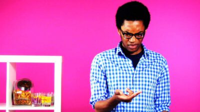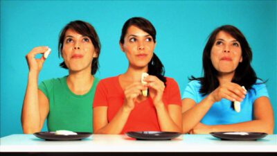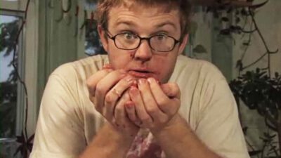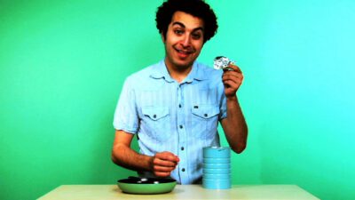 Transcript Woman: Dough stuck on your hands? Man: Quick tips! Woman: Rub dry cornmeal on them and it’ll come right off. Neat!