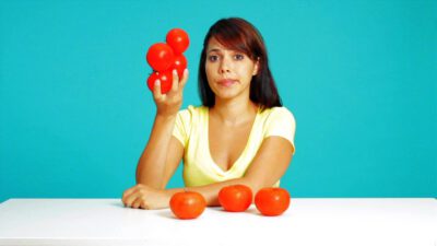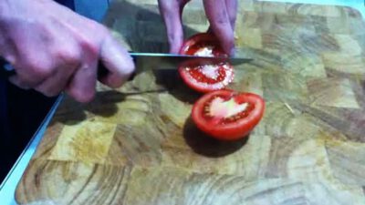 Transcript Male: Tomatoes need peeling? Female: Quick tips! Male: Put them in boiling water for about 45 seconds, then plop them into ice water. Your fingers will be able to slide the skins right off. Easy!