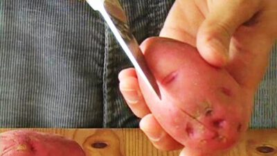 Instructions Step 1: Cut the potato skin Make a cut all around the potato, lengthwise. Try to slice only the skin, not the actual potato. Step 2: Boil it Put the potato in a pot of boiling water. Boil until it is soft inside Step 3: Cool it off Plunge the potato in ice water …