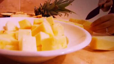 Instructions Step 1: Cut off the ends of the pineapple Cut off the leafy top and the base using a chef’s knife. Step 2: Cut off the rind in large strips Stand the pineapple on its bottom and slice away the rind in large strips, cutting deeply enough to remove the brown eyes without losing …