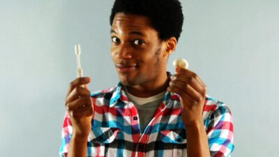 Transcript Man: What to share a banana with two buds? Woman: Quick tips! Man: Peel the fruit. Slide your thumb lengthwise down the center, and pull the remaining piece apart at the seam. Yum!