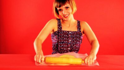 Transcript Woman: Rolling out pastry? Man: Quick tips! Woman: Stick the dough between two pieces of wax paper or plastic wrap so nothing sticks to your rolling pin. Genius!