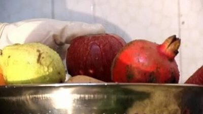 Transcript Woman: Washing fruits and vegetables? Man: Quick tips! Woman: Use a solution of one part vinegar to three parts water to remove bacteria, then rinse. Spiffy!