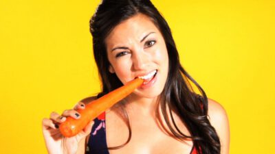 Transcript Male: Got thick carrots? Female: Quick Tips! Male: Slice them in half lengthwise, then dice them with the flat side down. Easy!